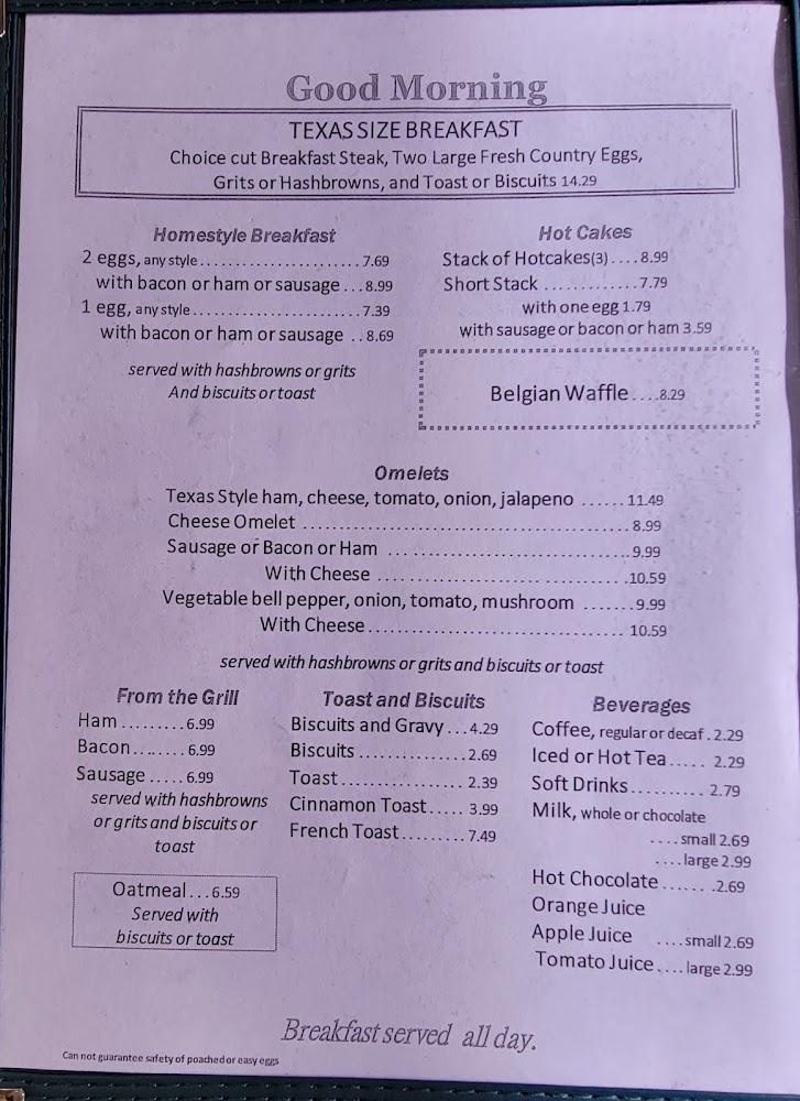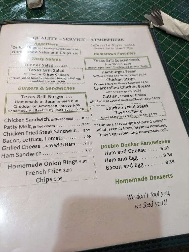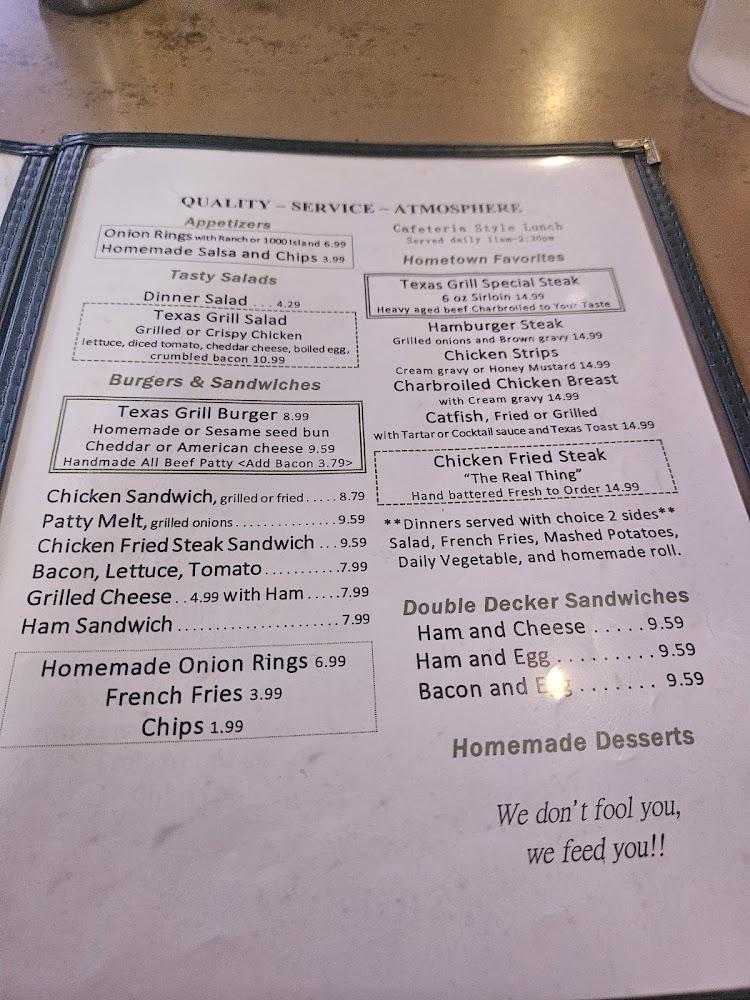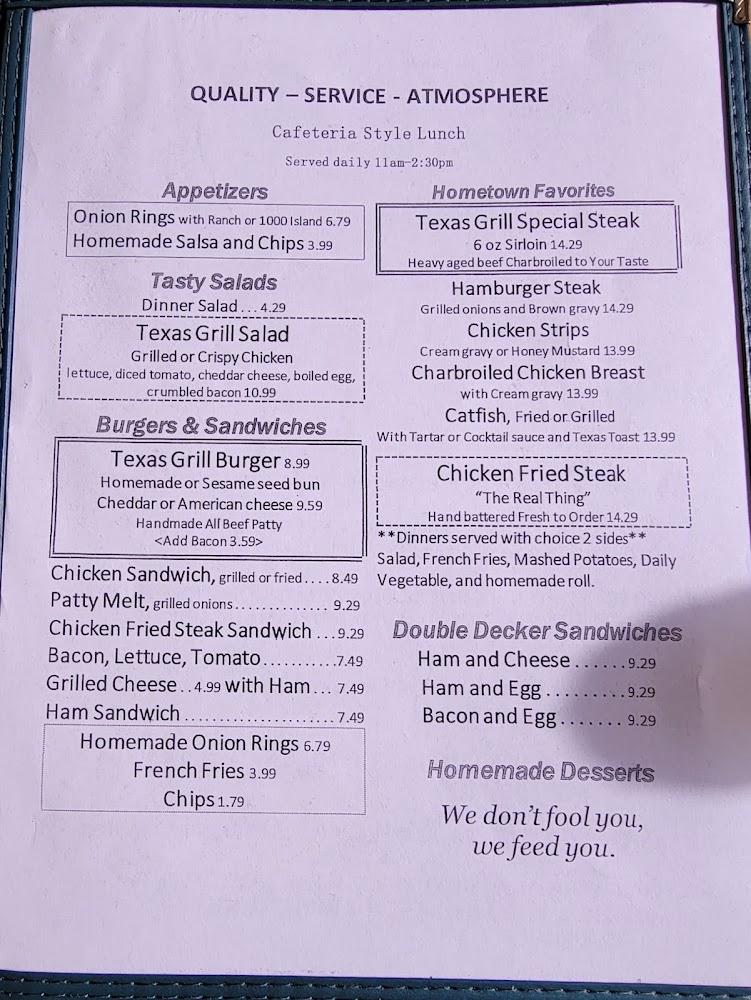 The menu at Texas Grill Restaurant offers a delightful array of dishes that celebrate local flavors. Breakfast shines with options like omelets and hash browns, ideal for starting your day right. The chicken fried steak is famous among frequent visitors, showcasing southern culinary traditions.